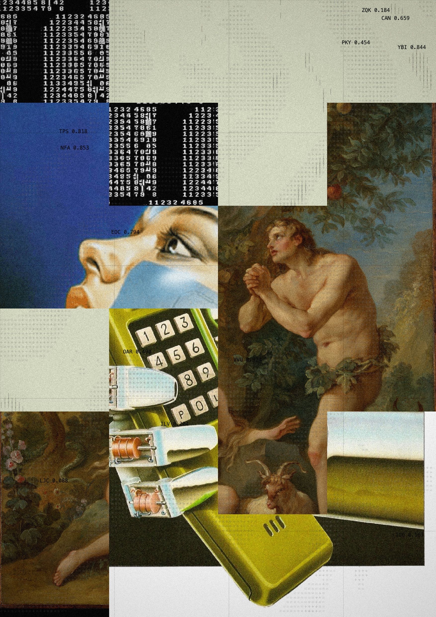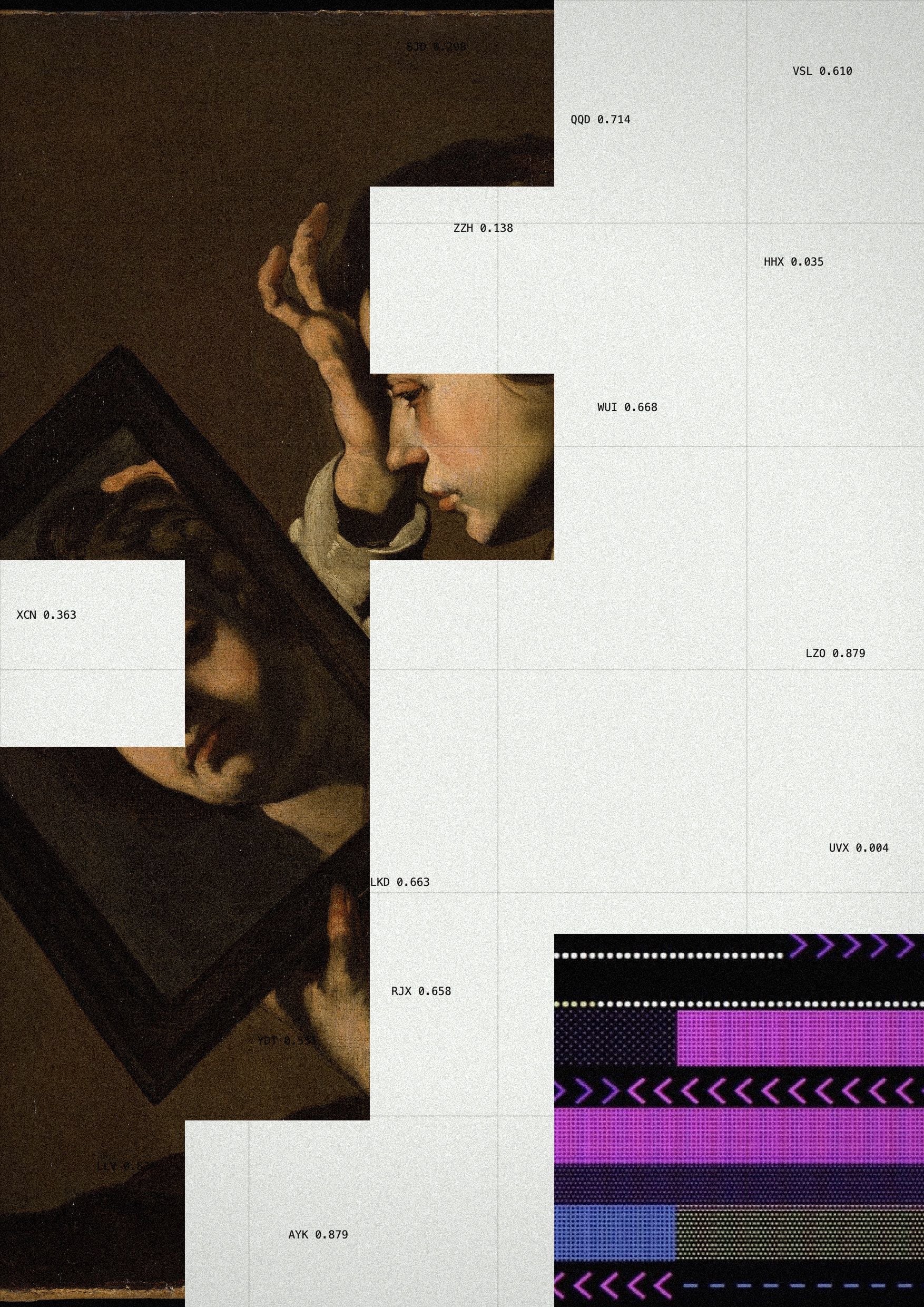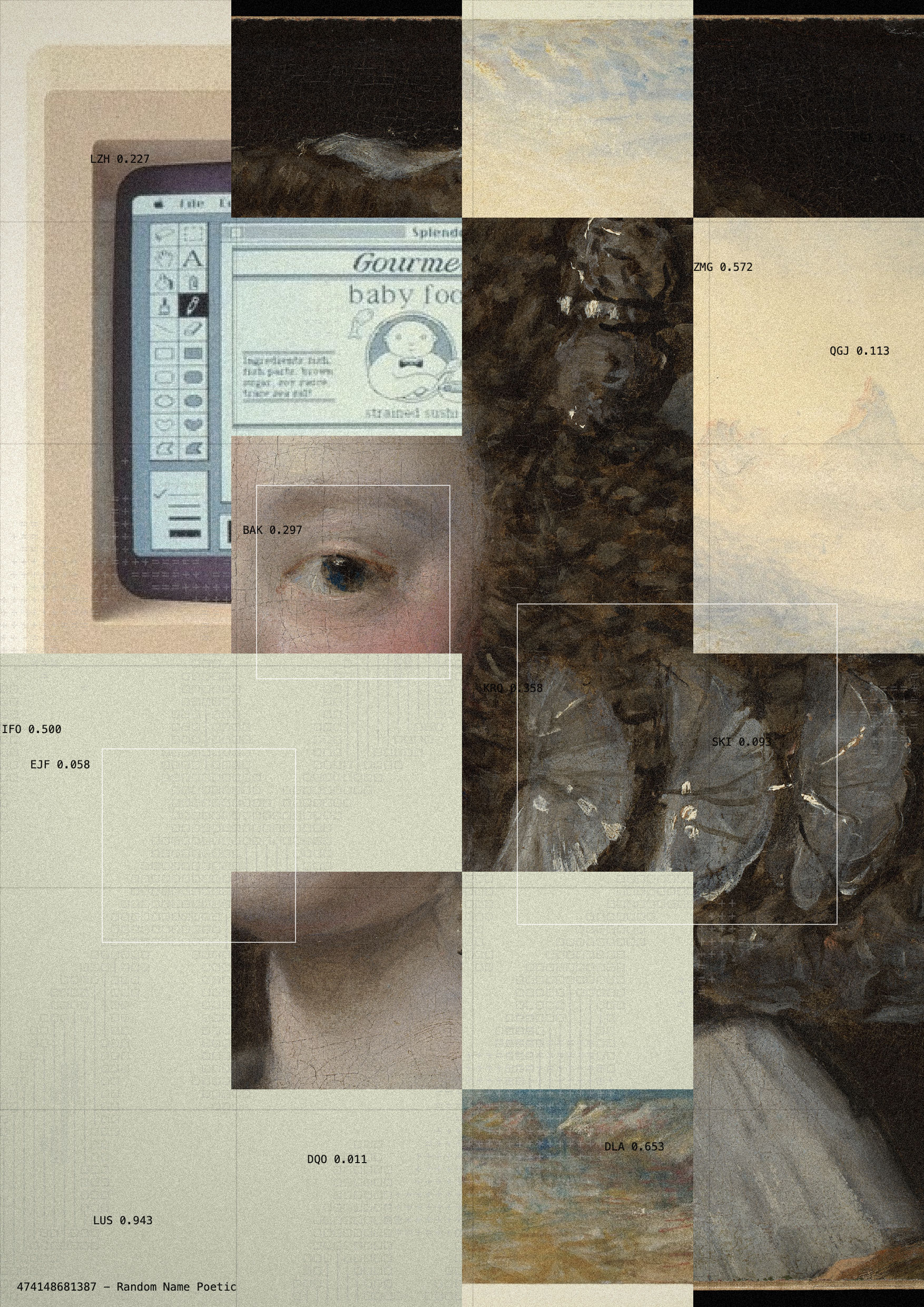 The artworks explore that fault line. Classical paintings, early computer interfaces, neon vector grids, and digital remnants sit side by side, compressed into a single surface much like features in a neural layer. The small coded labels scattered across the images resemble confidence scores, quiet indicators of the hidden mathematics.
