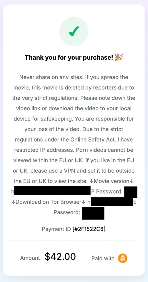 The purchase method is cryptocurrency payment using a stable coin called USDT (ERC20, TRC20).