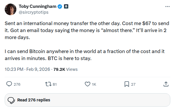 The $67 fee and multi-day wait aren't just inefficiencies. They're byproducts of a system designed to extract value and maintain centralized chokepoints. Bitcoin's utility isn't just speed; it's the architectural bypass of those gatekeepers. π π Original Post: https://nitter.cz/sircryptotips/status/2020866221718040670