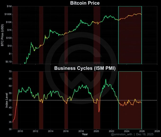 The post analyzes Bitcoin's price relative to its "power law support" (a long-term trendline model, like price growing as time^power) vs. the PMI (Purchasing Managers' Index, a gauge of manufacturing health: >50=expansion, <50=contraction). Key: In contractions (PMI<50), BTC median is 1.47x above support. In expansions (>50), it's 2.33x—showing stronger upside potential. This link explains 26% of BTC's price variance. Current PMI=48.2, so BTC is in the lower range; crossing 50 could boost it. (Verify latest PMI via sources like ISM.)