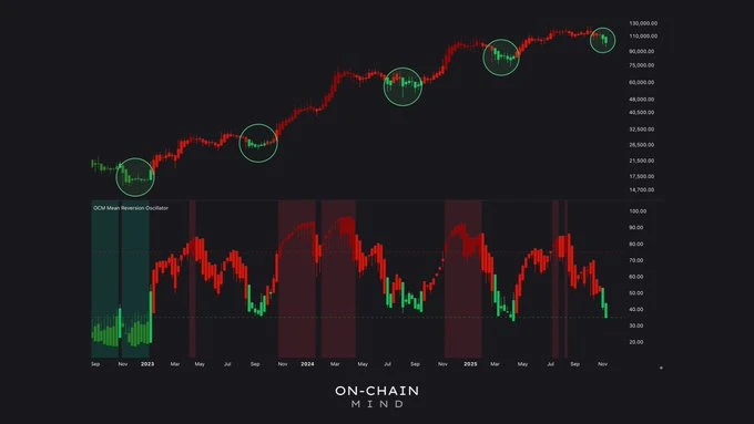 ➡️Bitcoin News: Bitcoin's Mean Reversion Oscillator just printed its first green (oversold) bar since April this year.