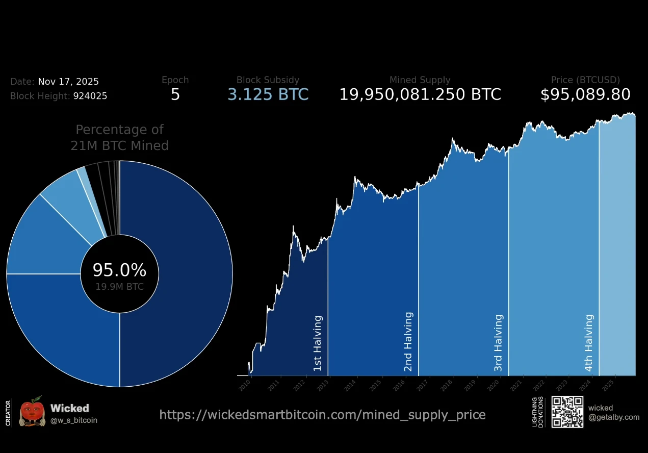 ➡️'95% of the 21 million Bitcoins have officially been mined. Only 5% of BTC supply left to be mined over the next 114 years!' - Wicked