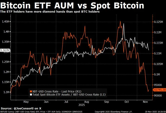 'OG bitcoin whales are dumping, and sentiment is horrible. Meanwhile, JPMorgan has a $170k price target, and 99.5% of funds in the spot bitcoin ETFs haven't sold in this 20% drawdown. A complete inversion of pre-2024 norms. This is a totally different market now.' - Joe Consorti
