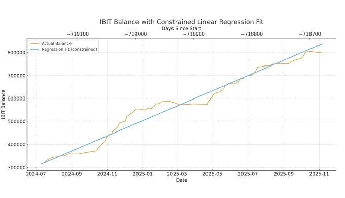 > 'IBIT alone is buying 1,200 BTC / day (all day average). All ETFs + MSTR 2,000 BTC / day = 1 MM BTC+ every 2 Years. (R2 = 93%).