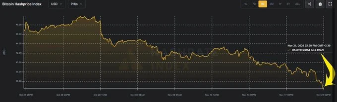 ➡️SwanDesk: 'Bitcoin Hashprice COLLAPSES to all-time low of $34.49/PH/s, down over -50% in weeks and the lowest in BTC’s entire history. This is much worse than even the 2021 China ban or the 2022 bear market. Miners are now hemorrhaging cash, which means forced selling and shutdowns are imminent.'