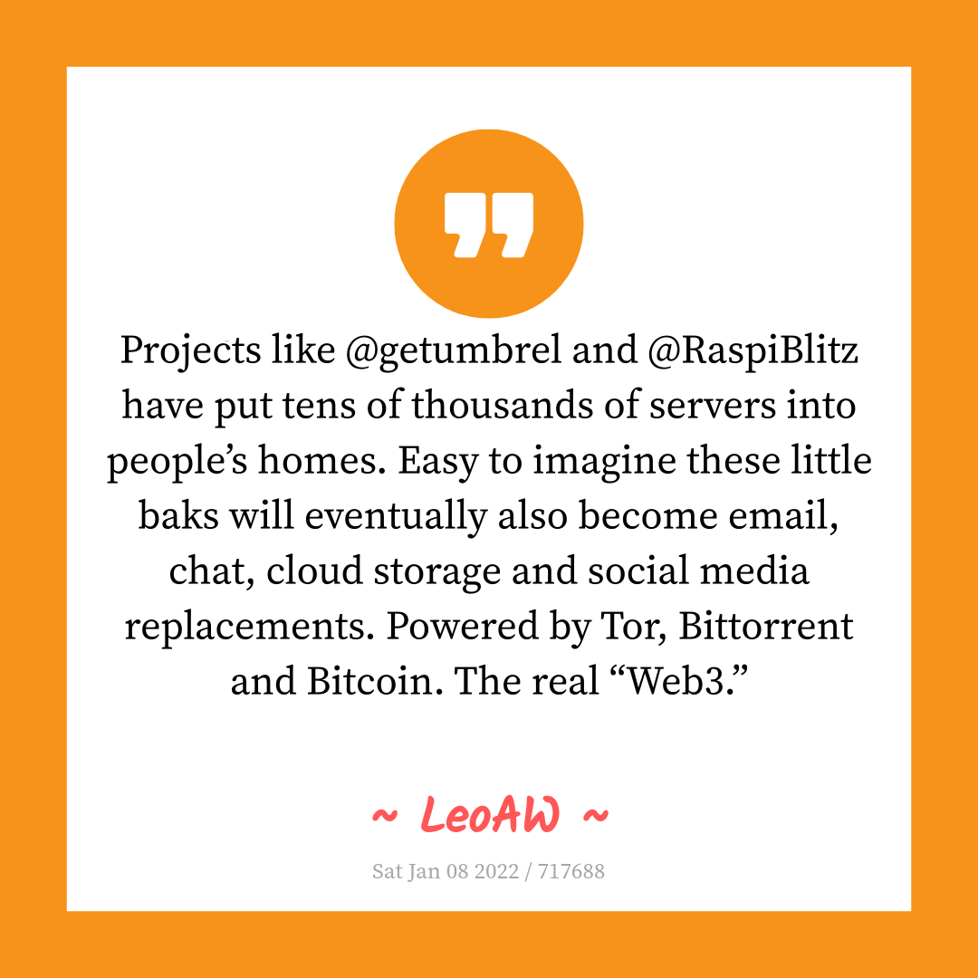 Projects like @getumbrel and @RaspiBlitz have put tens of thousands of servers into people’s homes. Easy to imagine these little baks will eventually also become email, chat, cloud storage and social media replacements. Powered by Tor, Bittorrent and Bitcoin. The real “Web3.” - #BitcoinTwitter