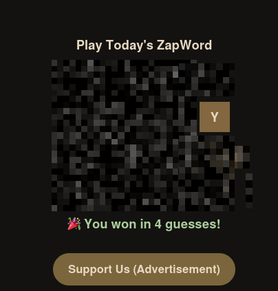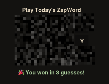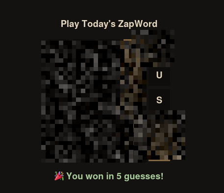 Greetings, One interesting hint for the day word Will you get it is less than 2 guesses ๐งฉ Just solved today's Zap Word in 3 guesses! ๐งฉโก Play Bitcoin games and #earn #sats at #SatsArcade ! ๐ฎ๐ฐ @SatsArcadeApp #play2earn https://satsarcade.app/?ref=U9BWX102 #bitcoin #zapWord #lightningNetwork Have fun