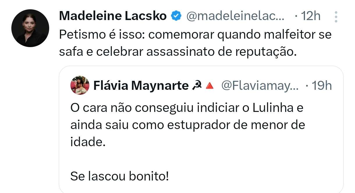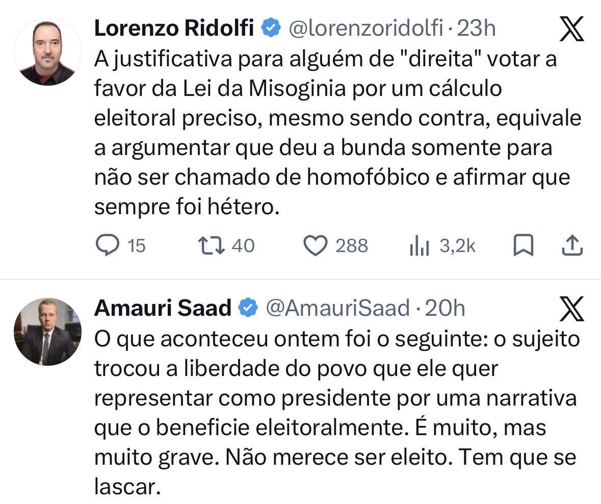 Essa "Lei da Misóginia" é uma excrescência. Decepção com todos que se dizem de direita e apoiaram essa destruição das bases da sociedade. Já existe crime de injúria e difamação. Perguntem como foi o voto de Flavio, Moro e cia LTDA. Puta que o pariu!