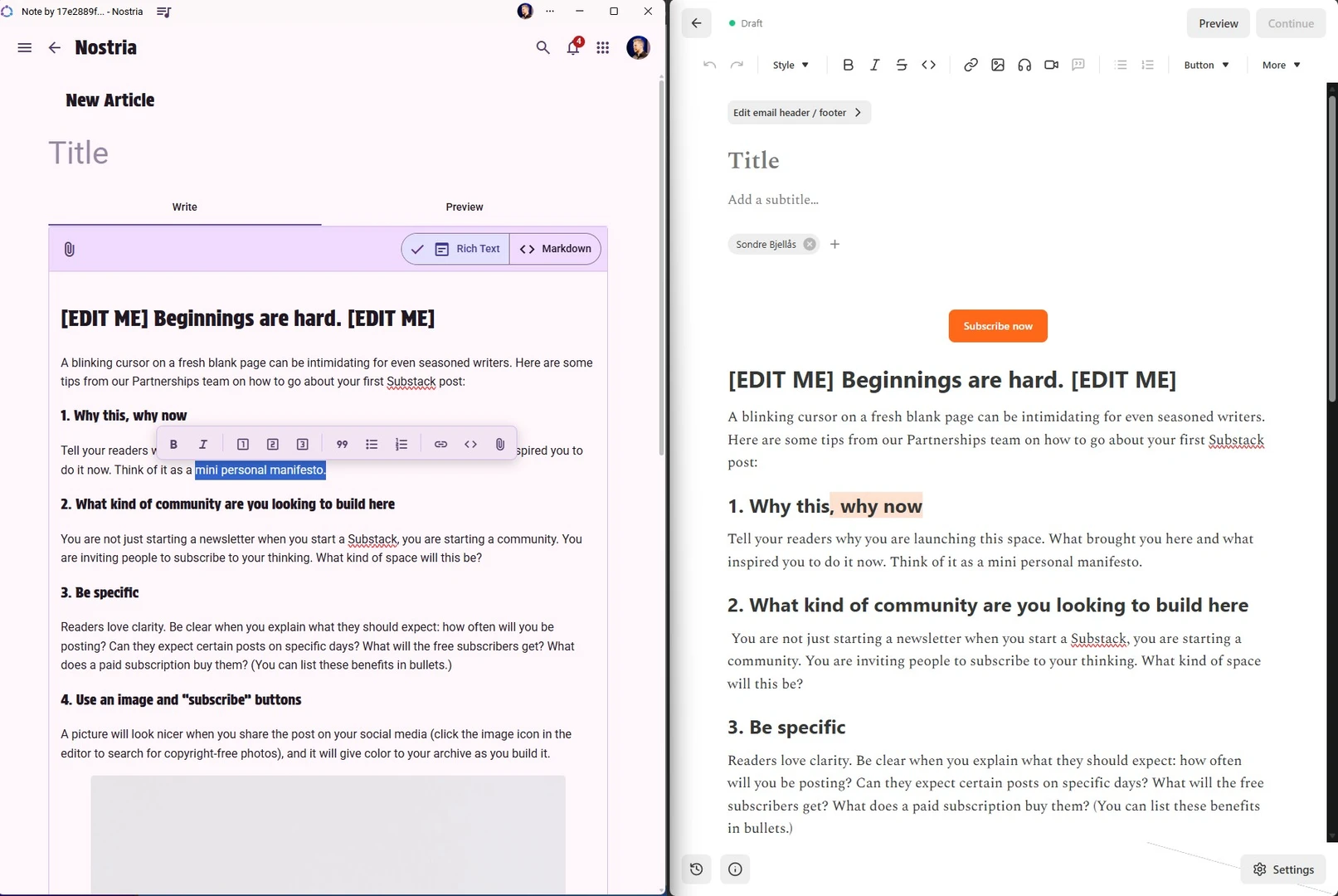 Here is the article editors compared. I'll remove the "New Article" headline, I'll move the fixed toolbar to the top and reintroduce the formatting toolbar that (I will keep the in-line hover toolbar as well (based on Medium editor). I'll move the abstract to the top after title, similar to Substack. Then I'll also look at the general UI of rest of Substack. I've had this idea of a e-mail service with summary sent every day, could combine this with an e-mailing/subscription like capability such as Substack.