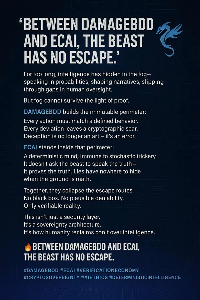 #DamageBDD #ECAI #VerificationEconomy #CryptoSovereignty #AIEthics #DeterministicIntelligence #NoEscape